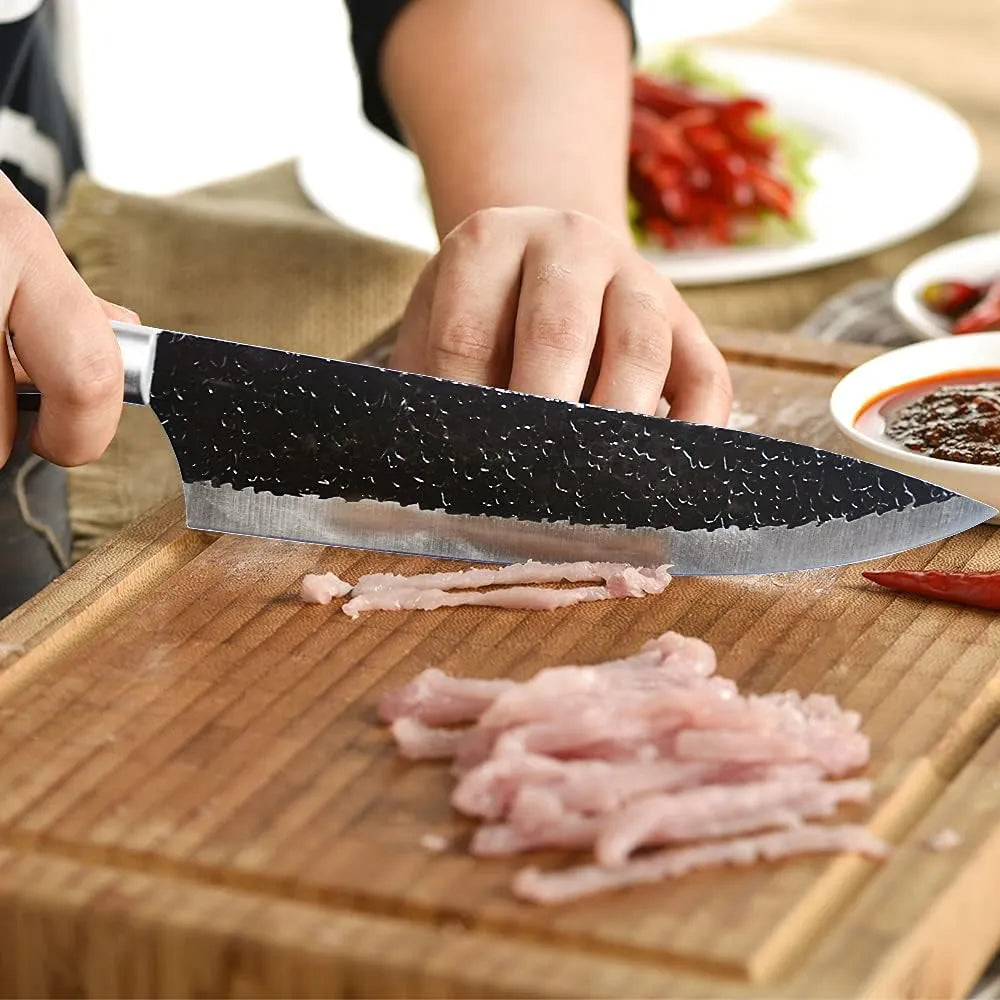 Sus hojas de acero inoxidable de alta calidad brindan filo duradero, mientras que los mangos de madera aportan comodidad, equilibrio y un diseño elegante estilo japonés martillado.