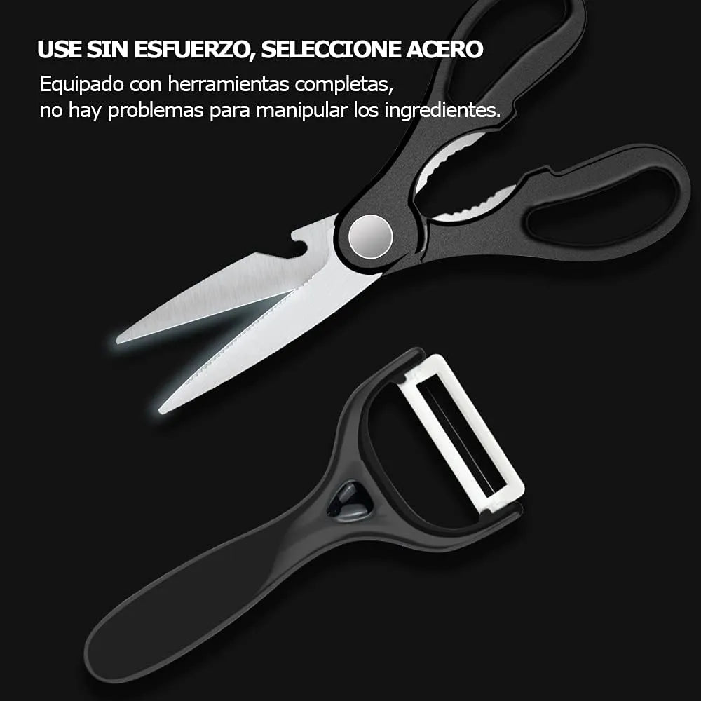 Set Cuchillos Cocina Acero Inoxidable + Pelador + Tijera Negro